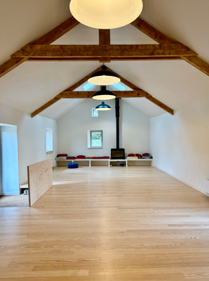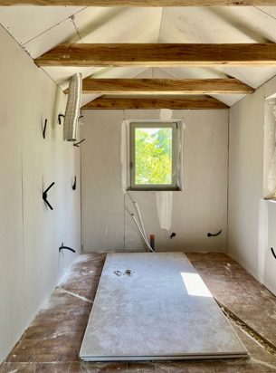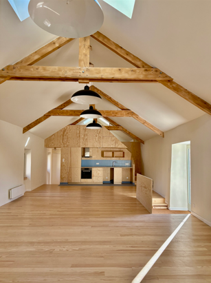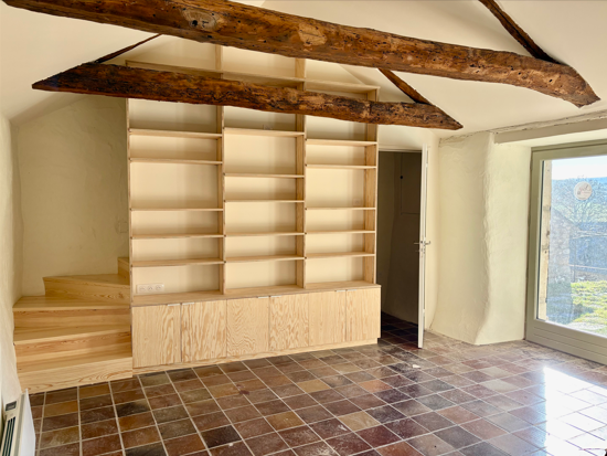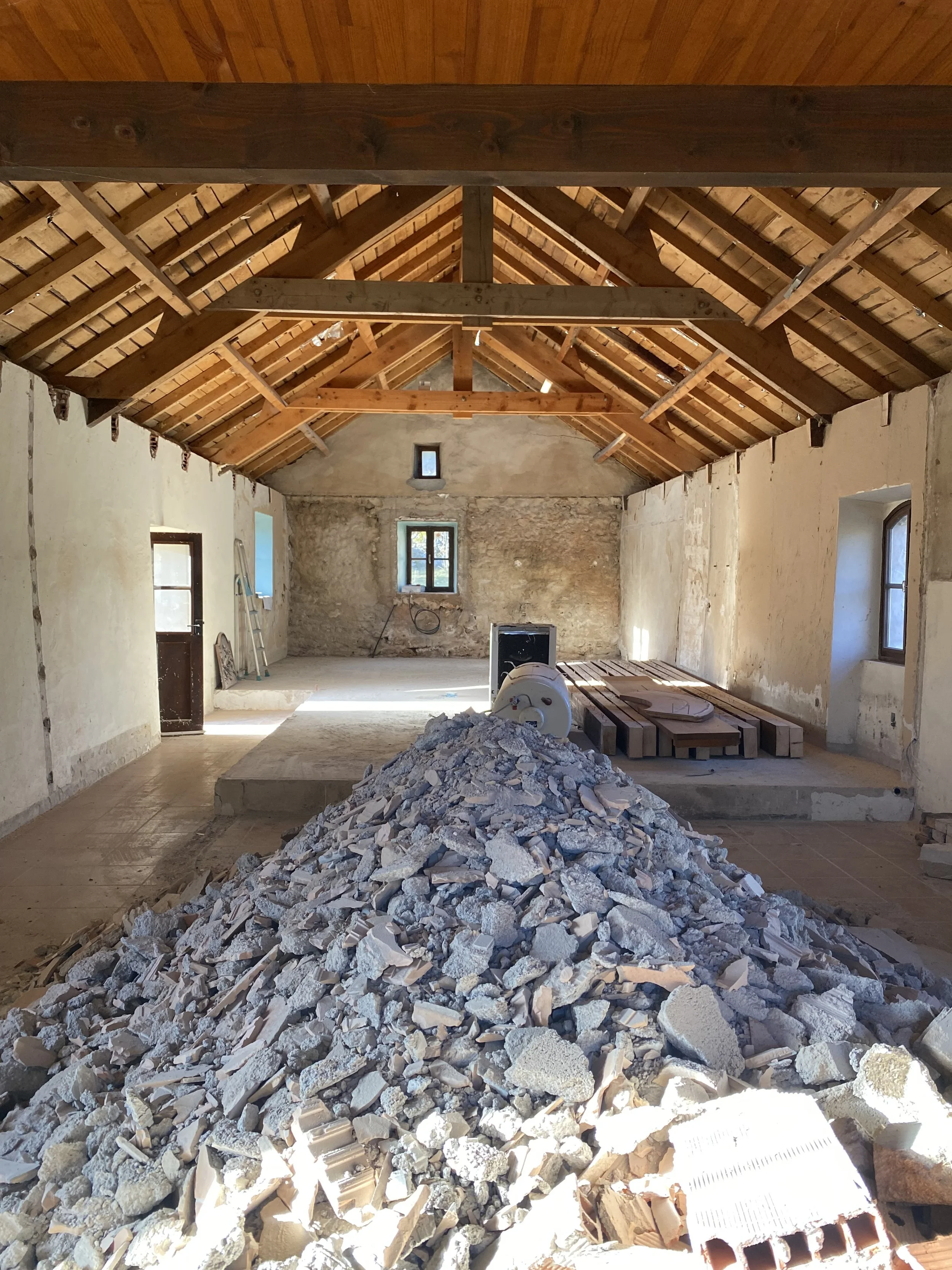 Plomberie et électricité sont remises aux normes, des ouvertures sont agrandies, les huisseries changées, le plafond isolé, un parquet est posé. Les commodités sont repoussées sous une mezzanine-dortoir, dans un coin de la pièce. 6 à 10 personnes pourront travailler et loger dans l’espace et dans les bâtiments adjacents.