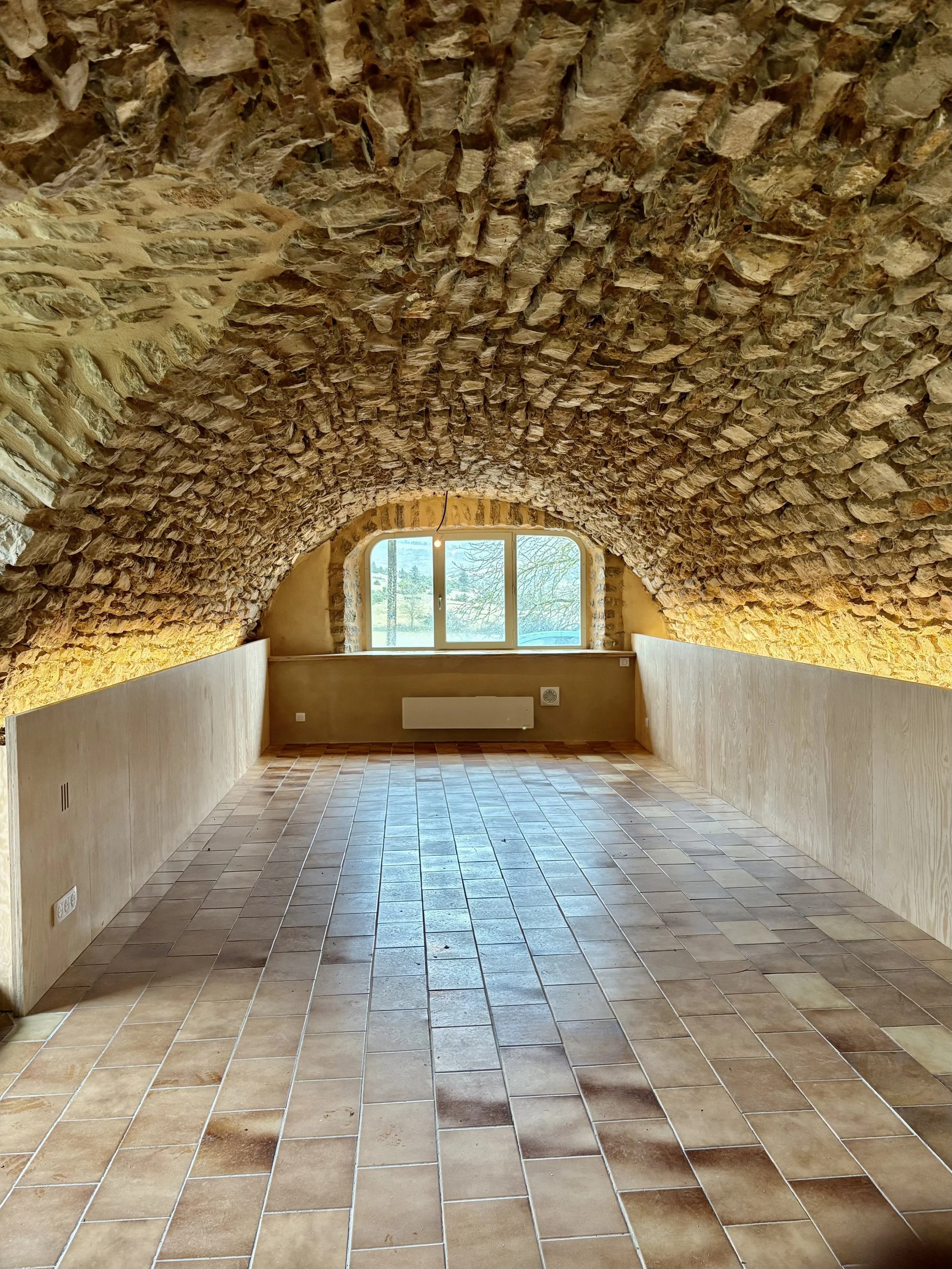 A hauteur de la route, la pièce voûtée, très humide est assainie. Elle abritera des expositions.